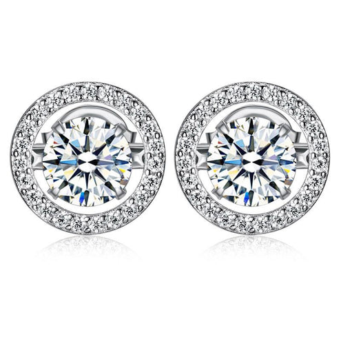 The new jewelry concept of these earrings allows the stone to continually move and create a consistent sparkle, alluding to the vision of a "dancing" stone. The main stone, with a clear white color, is set with a prong setting, making it the centerpiece of these earrings. The earrings are stamped with 925, a hallmark of the high-quality 925 Sterling Silver used in their creation.